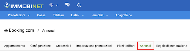 Associazione immobili: in ImmobiNet ora è necessario associare gli annunci esistenti su Booking.com con gli immobili presenti sul gestionale. Per farlo si va sulla Nuvoletta -> Booking.com -> clic sulla scheda Annunci. Qui va indicato, per ogni appartamento catalogato su Booking.com, il relativo immobile presente in ImmobiNet.