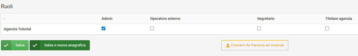 Nella parte inferiore della pagina si va poi a selezionare il ruolo del profilo creato (admin, operatore esterno, segretario o titolare agenzia).