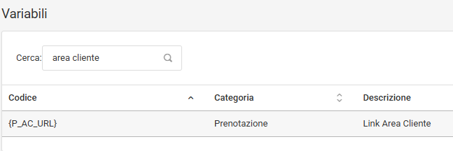 Da qui si aggiunge un nuovo template, oppure si può modificare quello già presente collegato alla prenotazione: si cerca sulla sezione delle variabili la voce "area cliente", e successivamente si copia nel testo il segnalino {P_AC_URL}.