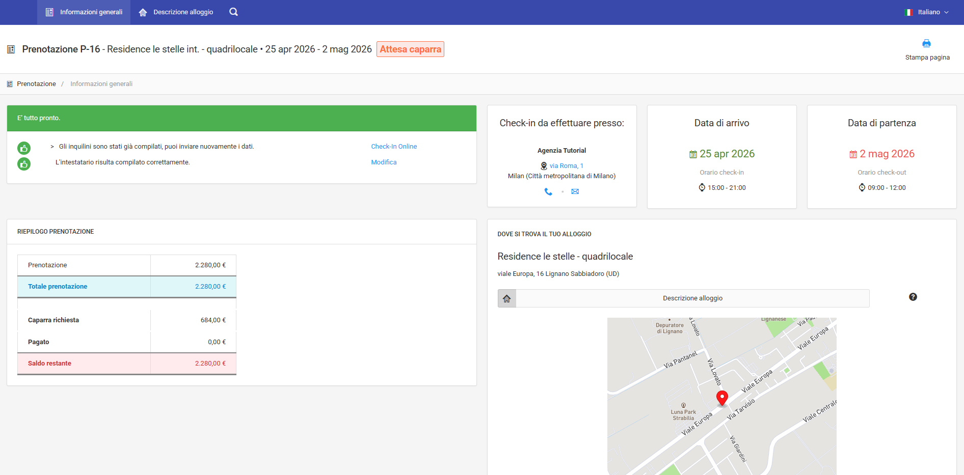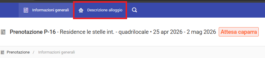 Inoltre, nella scheda Descrizione alloggio nella barra in alto, il cliente potrà avere accesso a tutte le informazioni che riguardano le caratteristiche dell'immobile in cui soggiornerà, incluse le foto, il numero di stanze, la mappa e i punti di interesse nelle vicinanze.