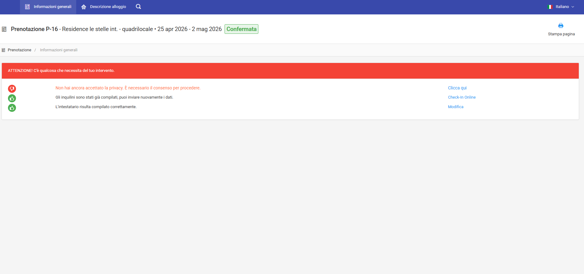 L'area cliente che viene visualizzata da chi ha effettuato la prenotazione si può personalizzare, vincolando la visualizzazione di alcuni dettagli alla compilazione di alcuni dati. Ad esempio, si può impostare che il cliente possa visualizzare i dati relativi alla prenotazione soltanto dopo l'accettazione del consenso GDPR.