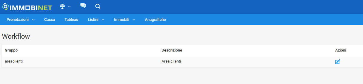 Per impostare questo flusso si cerca Workflow nel menù opzioni, e si va a modificare tramite la matita la voce Area clienti già presente in ImmobiNet.