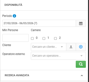 Qui si selezionano le date dalla voce periodo, mentre le voci min persone, camere, cliente e operatore esterno sono opzionali ma permettono chiaramente un maggior filtro degli immobili.