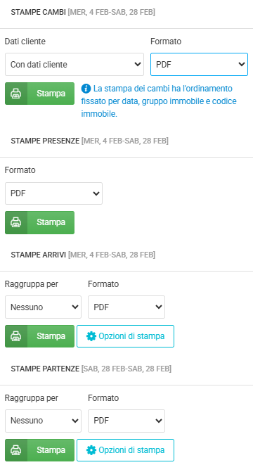 - Stampe presenze: simile alla stampa cambi, comprende l’elenco delle persone presenti negli immobili
